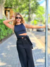 Confeccionada em suplex, tecido com ótima elasticidade e conforto. Possui amarração na cintura que valoriza a silhueta e permite ajustar conforme o corpo. Modelo versátil, ideal para compor looks modernos e elegantes.