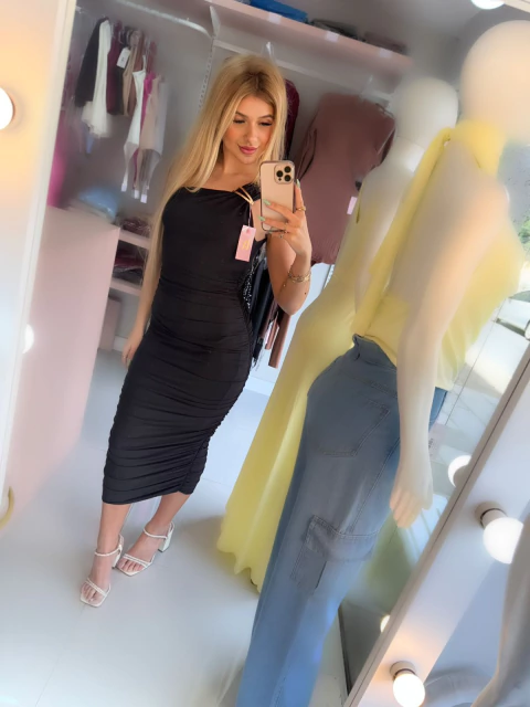 Possui drapeado frontal que valoriza as curvas e detalhe dourado na alça, agregando sofisticação e charme.